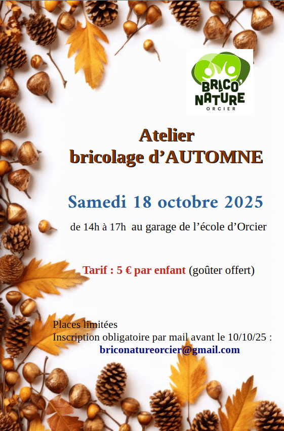Atelier bricolage d’automne – Brico’Nature + Ajouter à mon Agenda Google + Exportation iCal / Outlook 00 jours 00 heures 00 minutes 00 secondes Lieu Ecole d'orcier Chef-lieu 74550 Orcier