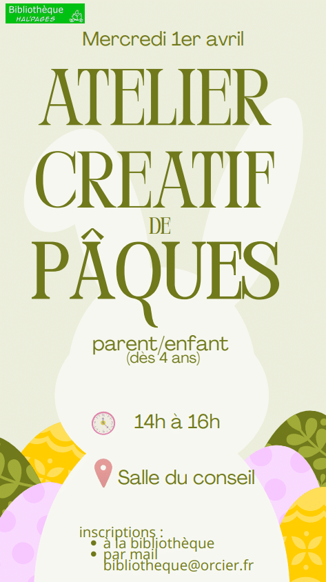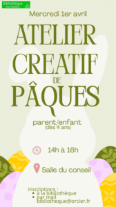 Atelier créatif de Pâques – Mercredi 1er avril – Mairie + Ajouter à mon Agenda Google + Exportation iCal / Outlook L'événement est terminé. Lieu Mairie d'Orcier Place de la Mairie, 74550 Orcier Site Web https://www.orcier.fr/