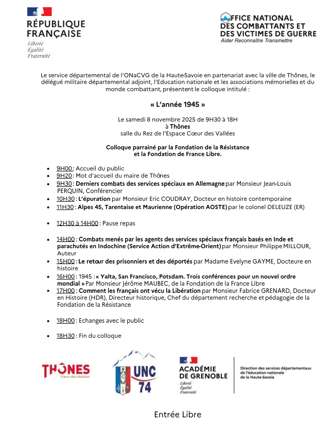 Colloque « L’année 1945 » – Office national des combattants et des victimes de guerre. 20251009 Programme du colloque du 8 novembre + Ajouter à mon Agenda Google + Exportation iCal / Outlook 00 jours 00 heures 00 minutes 00 secondes