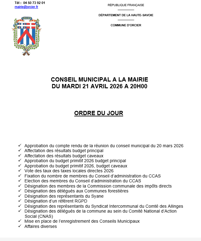 Conseil Municipal – Mairie – Mardi 21 avril 2026 – 20h + Ajouter à mon Agenda Google + Exportation iCal / Outlook 00 jours 00 heures 00 minutes 00 secondes Lieu Mairie d'Orcier Place de la Mairie, 74550 Orcier Site Web https://www.orcier.fr/