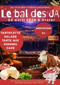 Le bal des JA – 4 avril 2026 – salle des fêtes d’Orcier + Ajouter à mon Agenda Google + Exportation iCal / Outlook 00 jours 00 heures 00 minutes 00 secondes Lieu Salle des fêtes Rue de l'École, 74550 Orcier