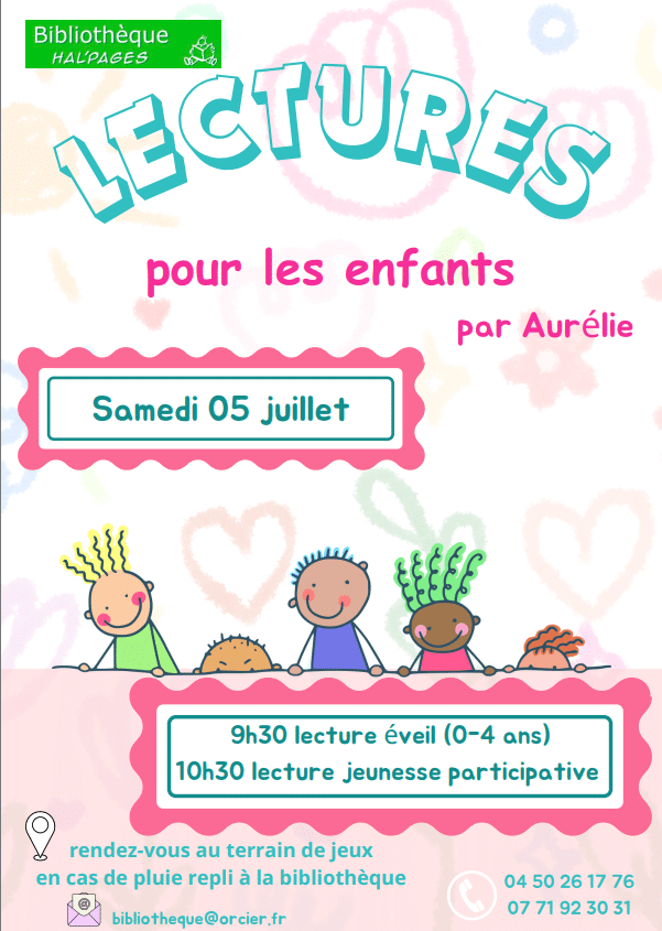 Lectures pour les enfants – Samedi 5 juillet 9h30 aire de jeux + Ajouter à mon Agenda Google + Exportation iCal / Outlook Lieu Bibliothèque d'Orcier 21 Route du Col du Feu 74550 ORCIER