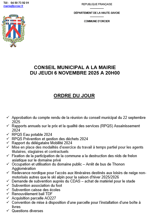 Ordre du jour du Conseil Municipal du 06 novembre 2025 – 20h + Ajouter à mon Agenda Google + Exportation iCal / Outlook Lieu Mairie d'Orcier Place de la Mairie, 74550 Orcier Site Web https://www.orcier.fr/