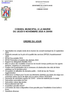 Ordre du jour du Conseil Municipal du 06 novembre 2025 – 20h + Ajouter à mon Agenda Google + Exportation iCal / Outlook 00 jours 00 heures 00 minutes 00 secondes Lieu Mairie d'Orcier Place de la Mairie, 74550 Orcier Site Web https://www.orcier.fr/