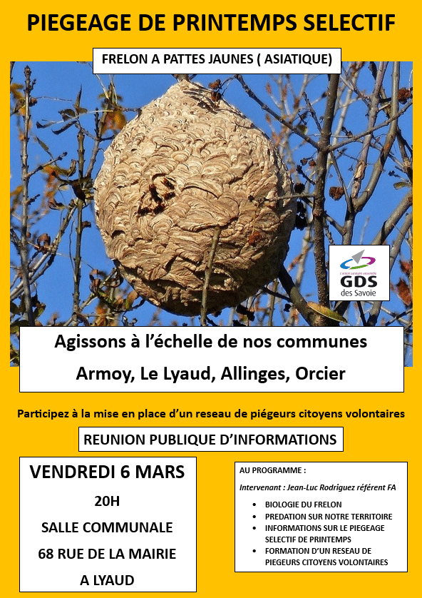 Réunion publique d’informations Frelons asiatiques – piégeage de printemps sélectif + Ajouter à mon Agenda Google + Exportation iCal / Outlook 00 jours 00 heures 00 minutes 00 secondes Lieu Salle communale du Lyaud
