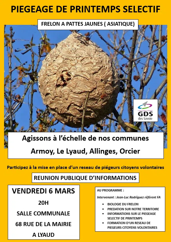 Réunion publique d’informations Frelons asiatiques – piégeage de printemps sélectif + Ajouter à mon Agenda Google + Exportation iCal / Outlook Lieu Salle communale du Lyaud