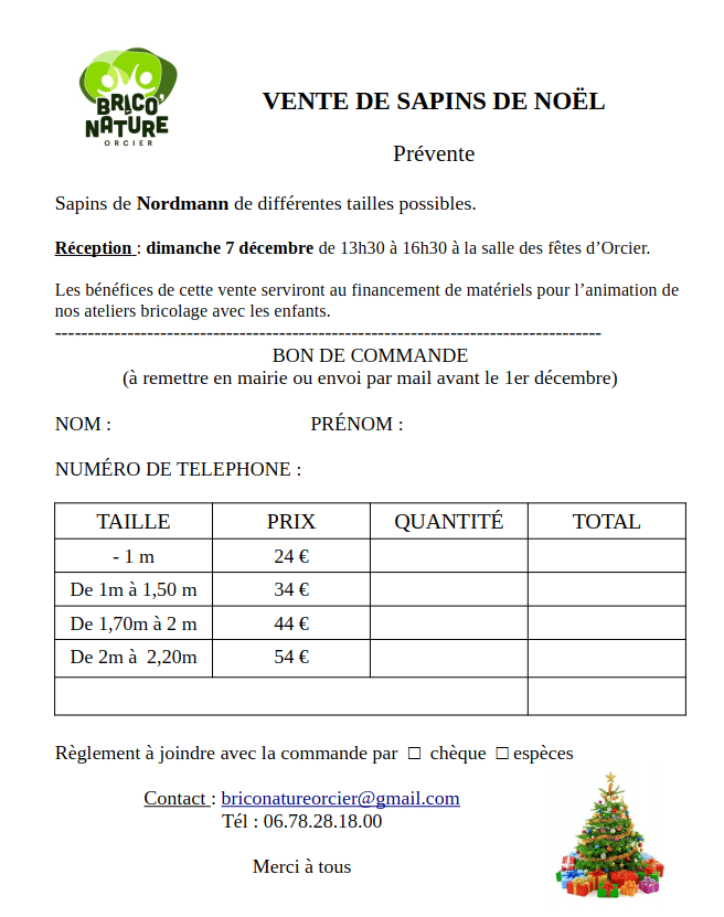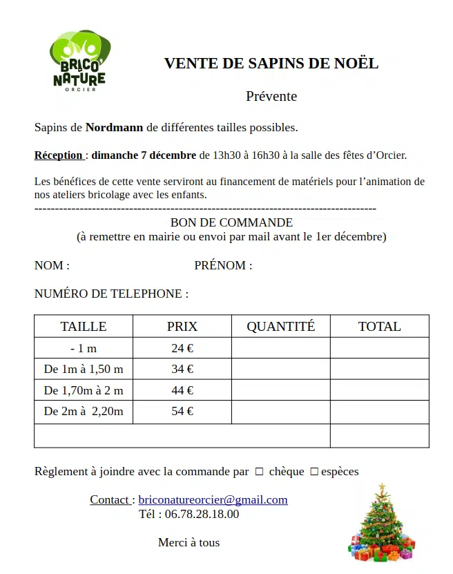 Vente de sapins de Noël – Brico’Nature flyer vente de sapins noël 2025 + Ajouter à mon Agenda Google + Exportation iCal / Outlook Lieu Salle des fêtes Rue de l'École, 74550 Orcier