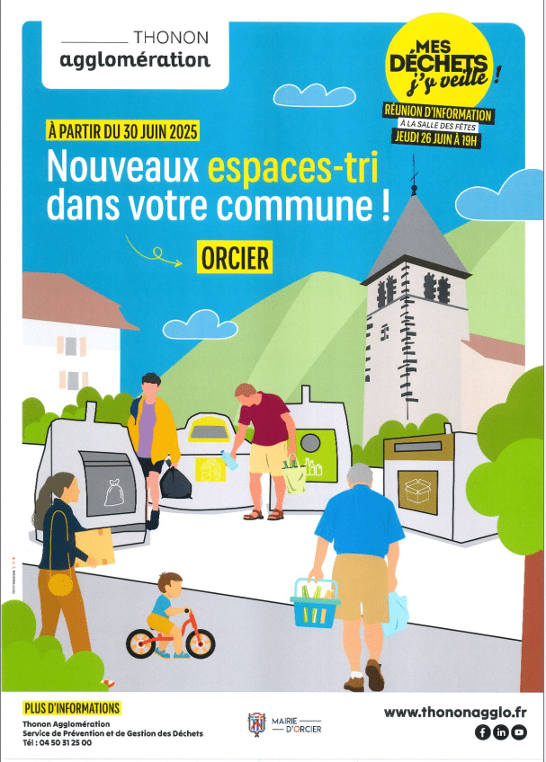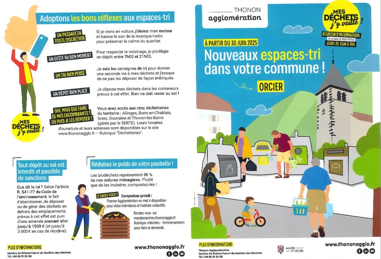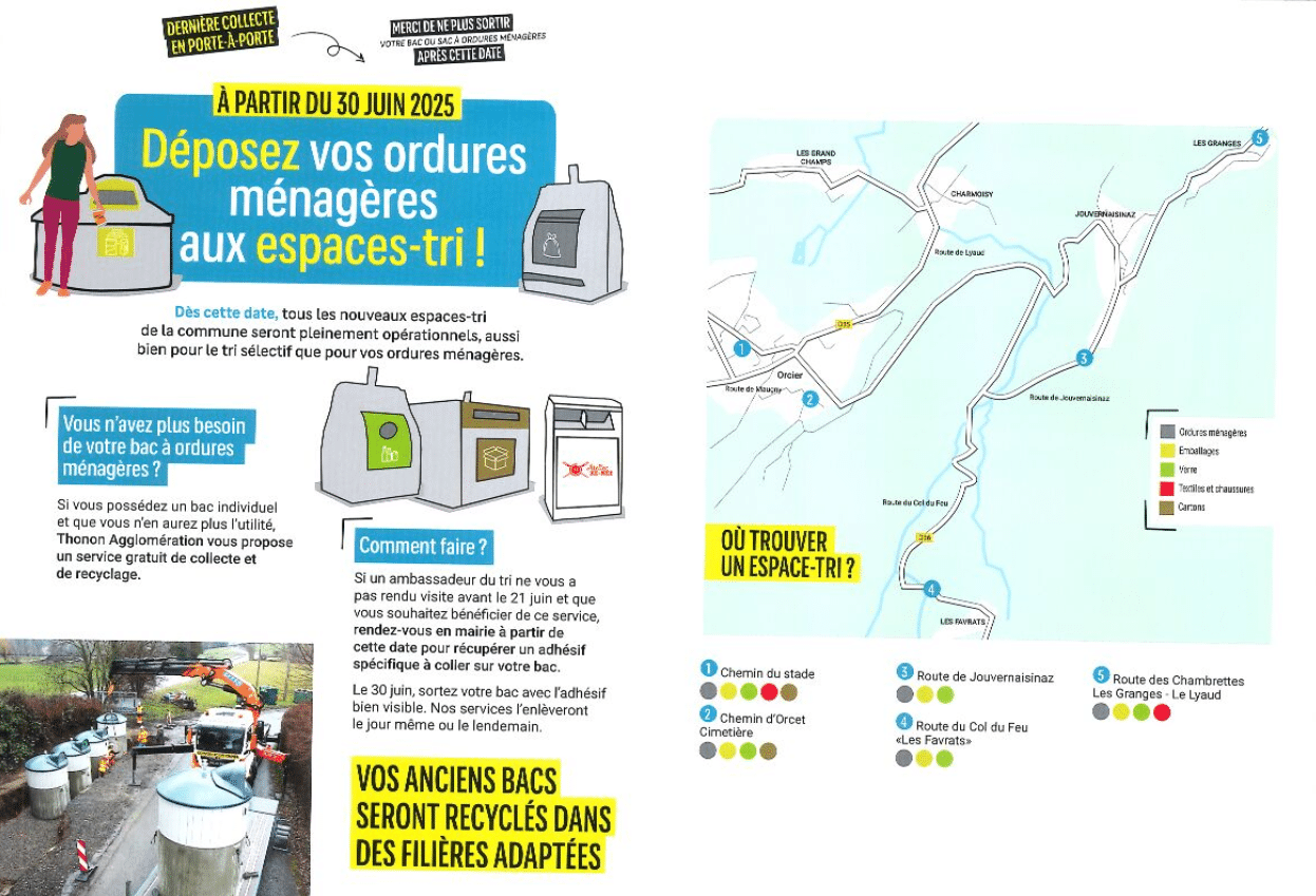 Attention, à partir du 30 juin 2025 il n’y aura plus de collecte des ordures ménagères en porte-à-porte. Vous pourrez déposer vos ordures ménagères dans les espaces-tri mis en place sur la commune.